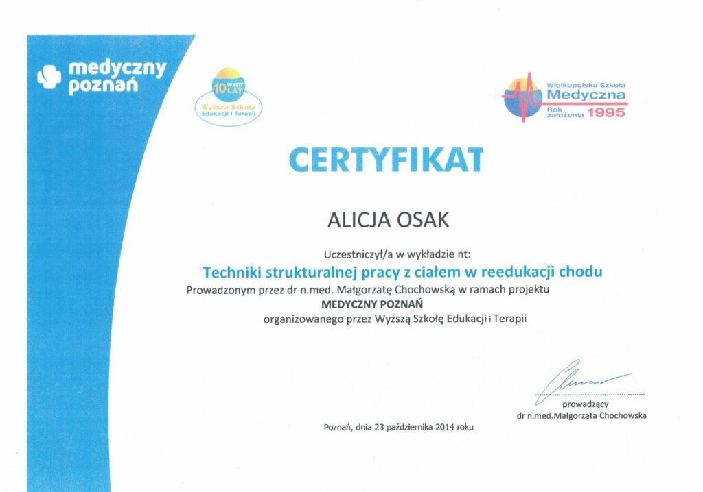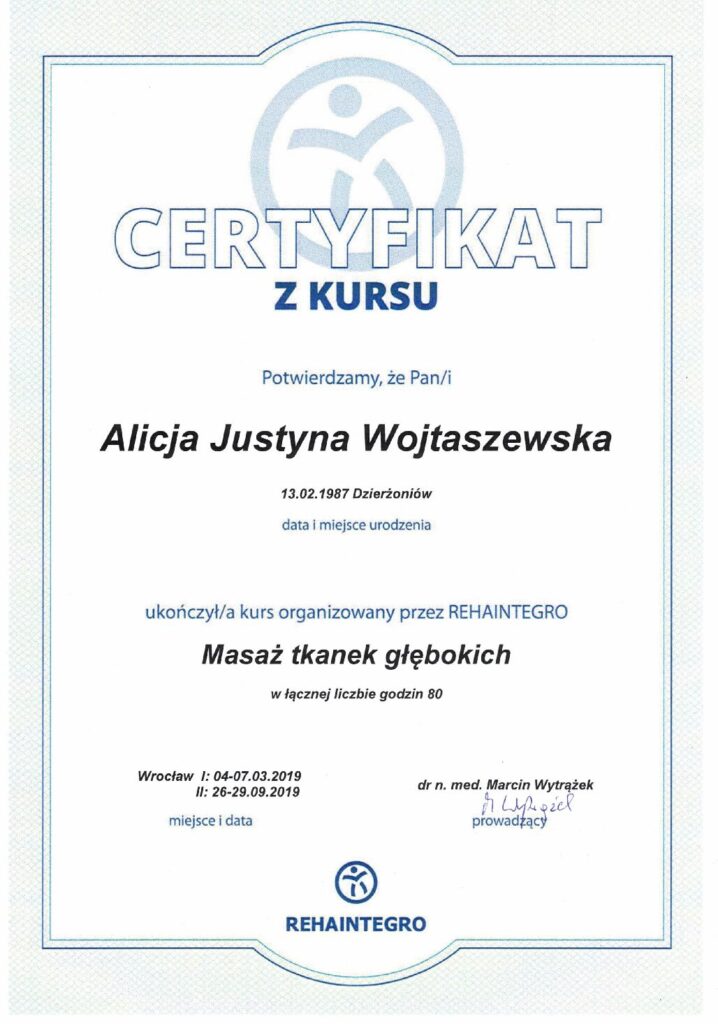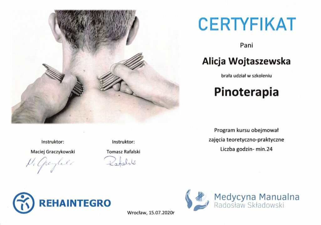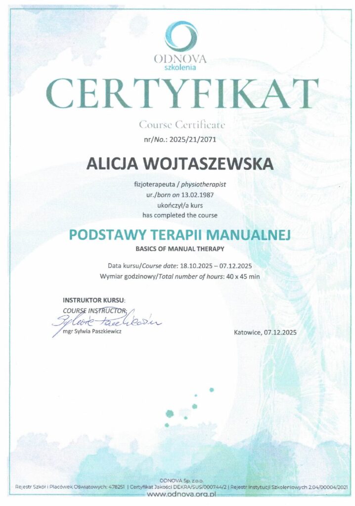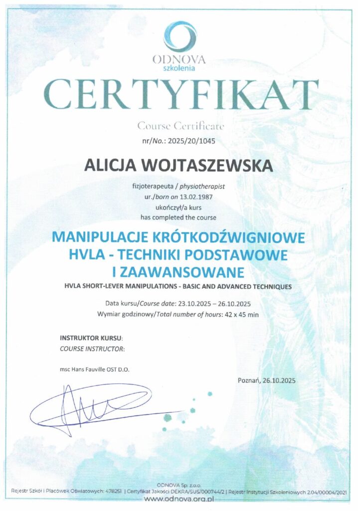 Manipulacje krótkodźwigniowe HVLA, terapia tkanek miękkich oraz integracja strukturalna.